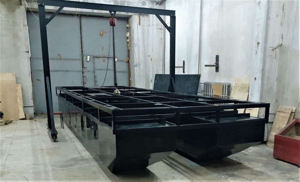 Самоходные понтоны собираются на базе блоков плавучести из ПНД труб, либо сварных ПНД конструкций. Модули плавучести крепятся к металлической раме. Размер и количество модулей плавучести зависит от предполагаемой грузоподъемности понтона и задач, предъявляемых заказчиком.